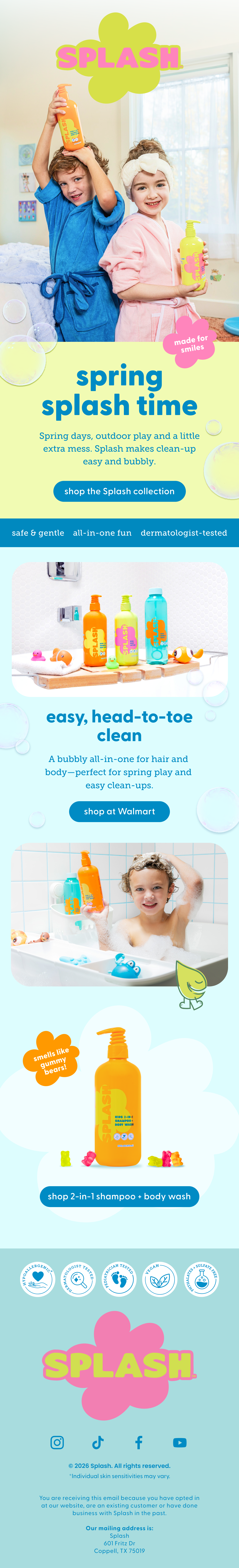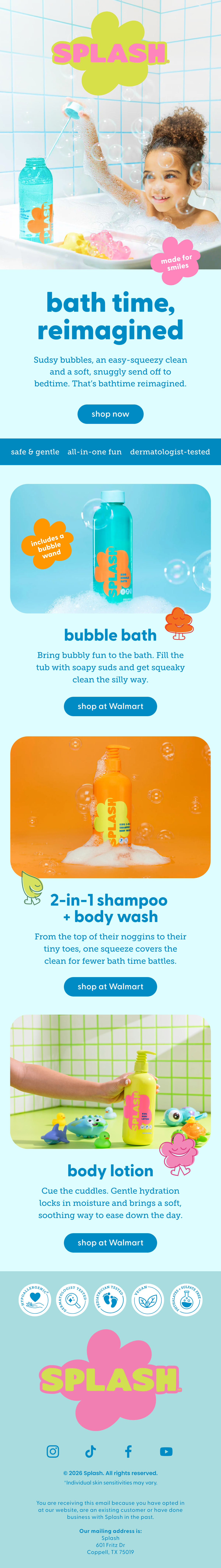 Splash is a kids body care brand built on bubble bath energy and big personality. As part of the creative team, I worked across video ads for Amazon and Disney+, email newsletters, PDP design, and overall design direction, helping bring a brand made for kids to life across every format.